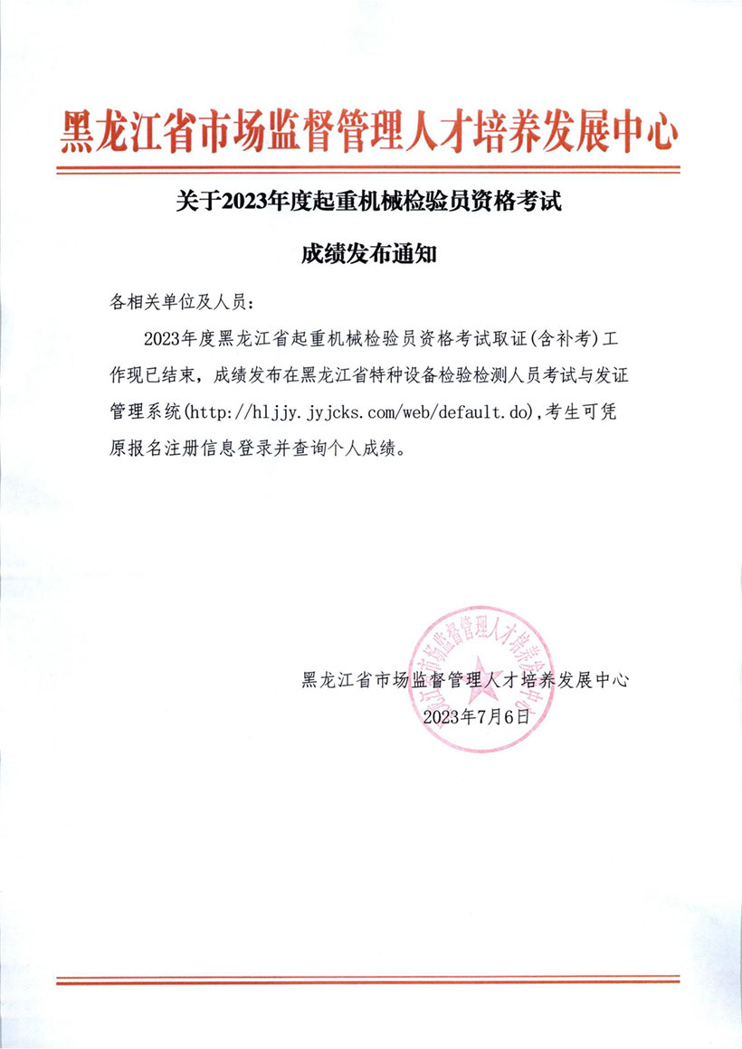 关于2023年度起重机械检验员资格考试成绩发布通知
