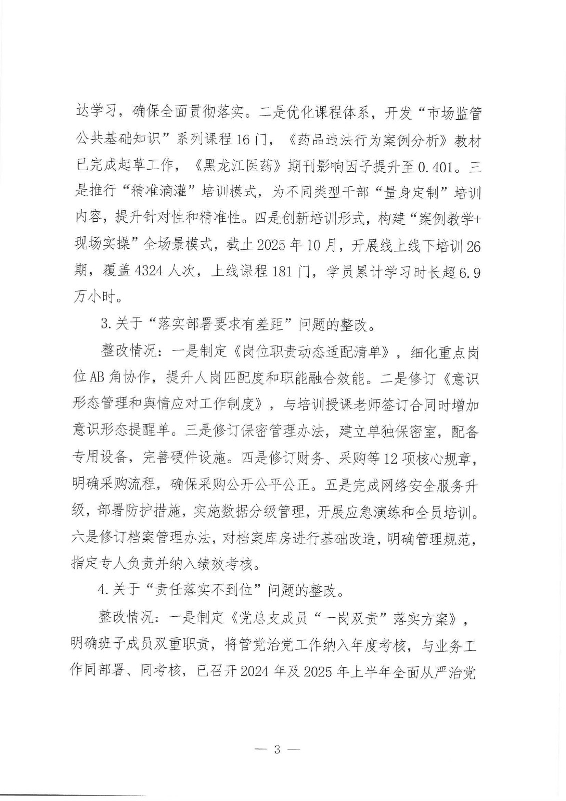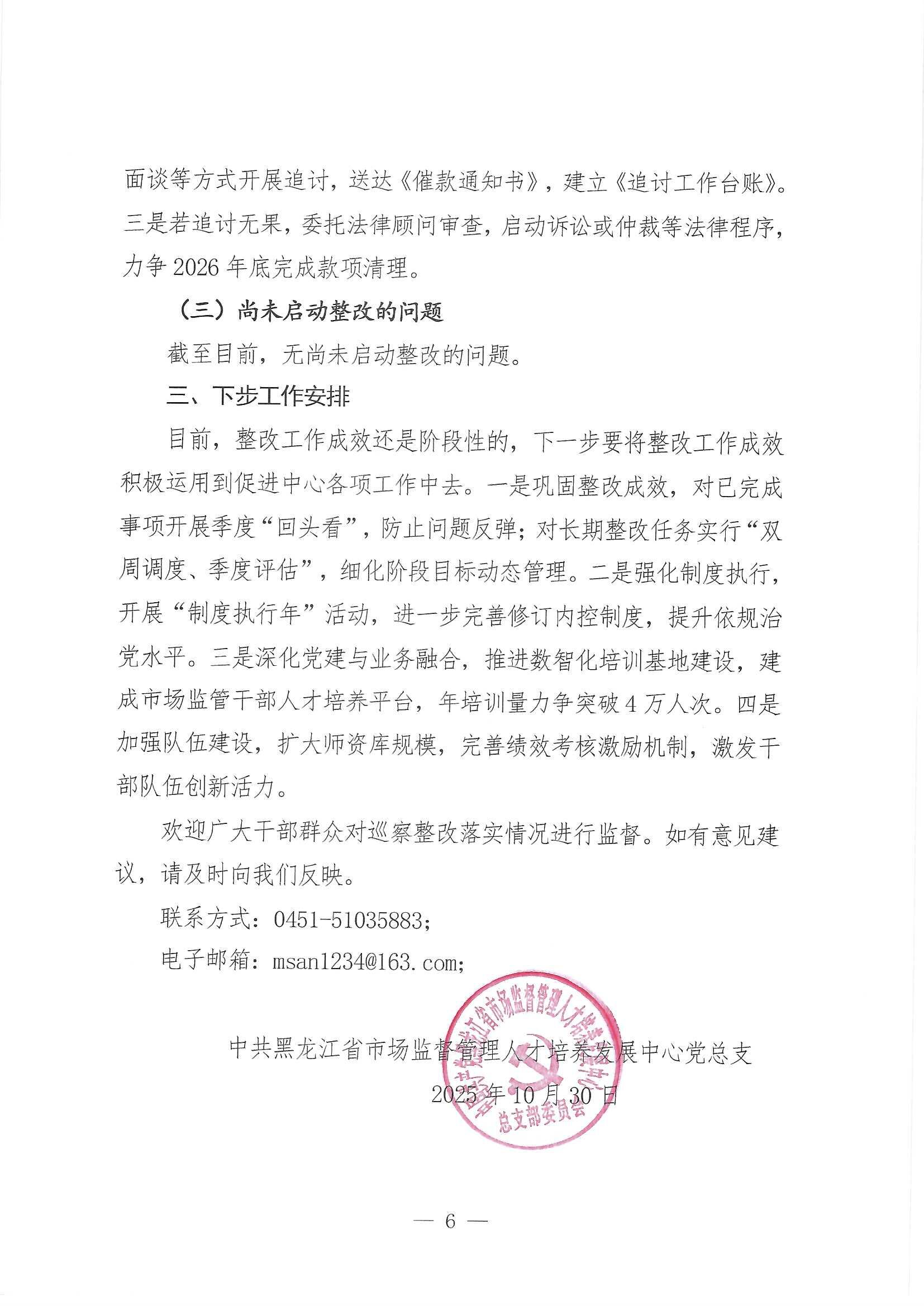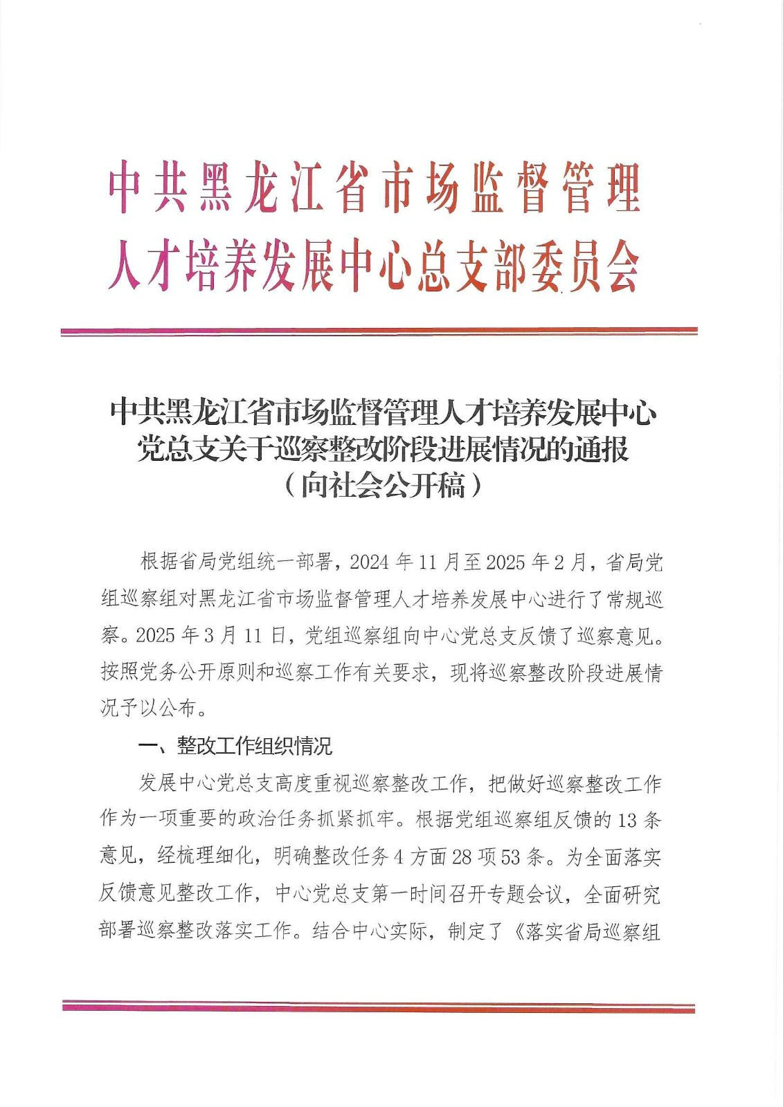 中共黑龙江省市场监督管理人才培养发展中心党总支关于巡察整改阶段进展情况的通报